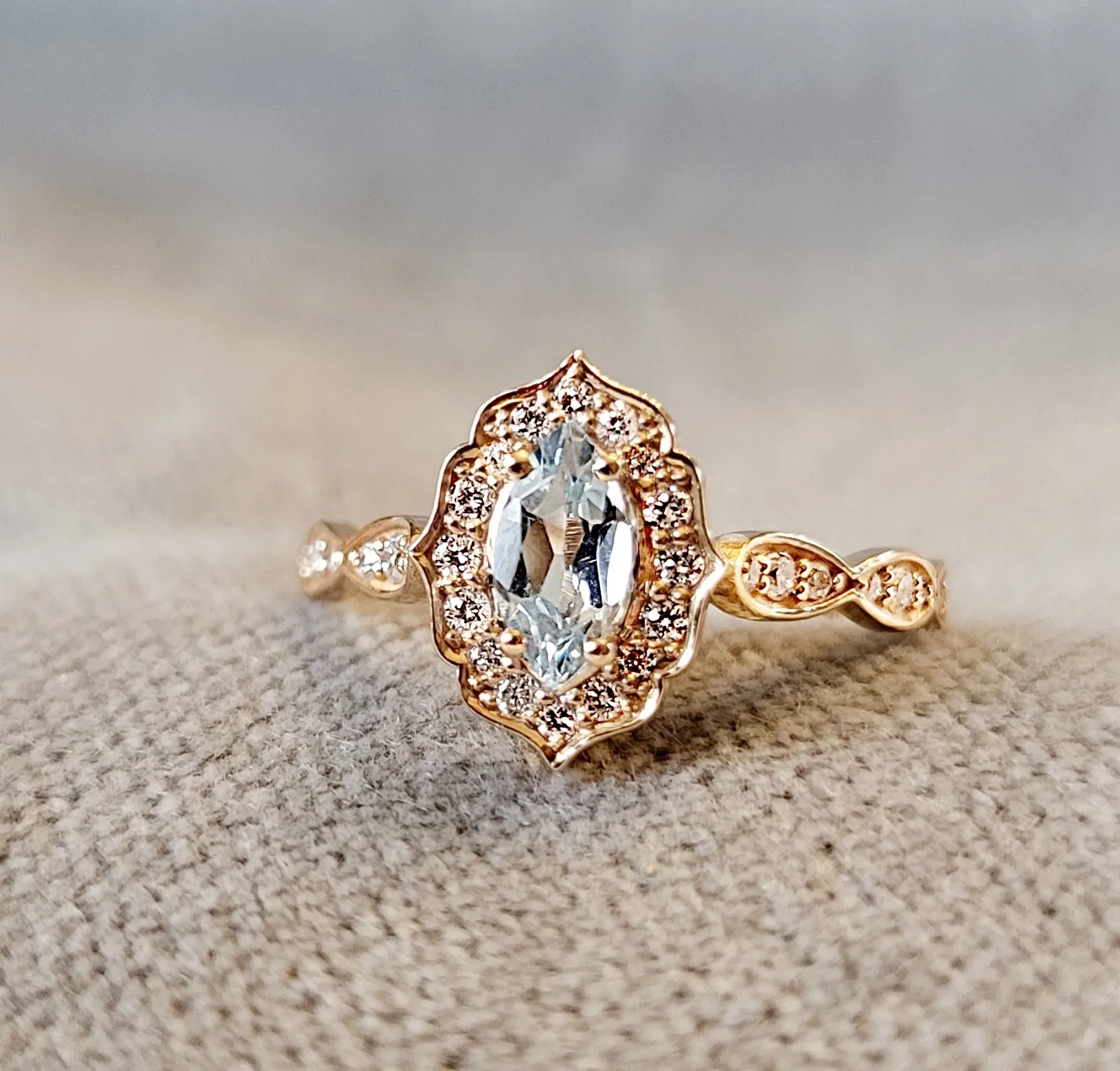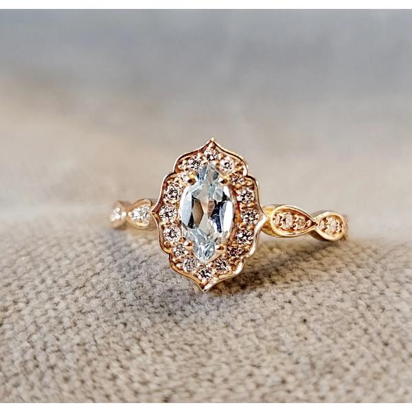 Vintage Markiz Blu Topaz Pırlantalı 14k Altın Yüzük